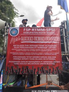 TimsusNews.com, Kota Bekasi, Jawa Barat. – Federasi Serikat Pekerja Rokok Tembakau Makanan Minuman Serikat Pekerja Seluruh Indonesia (FSP RTMM-SPSI) Kabupaten/Kota Bekasi menggelar aksi demonstrasi menuntut keadilan atas pemutusan hubungan kerja (PHK) sepihak yang dilakukan oleh PT Nirwana Lestari. Aksi ini dilangsungkan sebagai bentuk penolakan terhadap praktik *union busting* yang diduga dilakukan oleh manajemen perusahaan. Selasa, (20/5/2025).