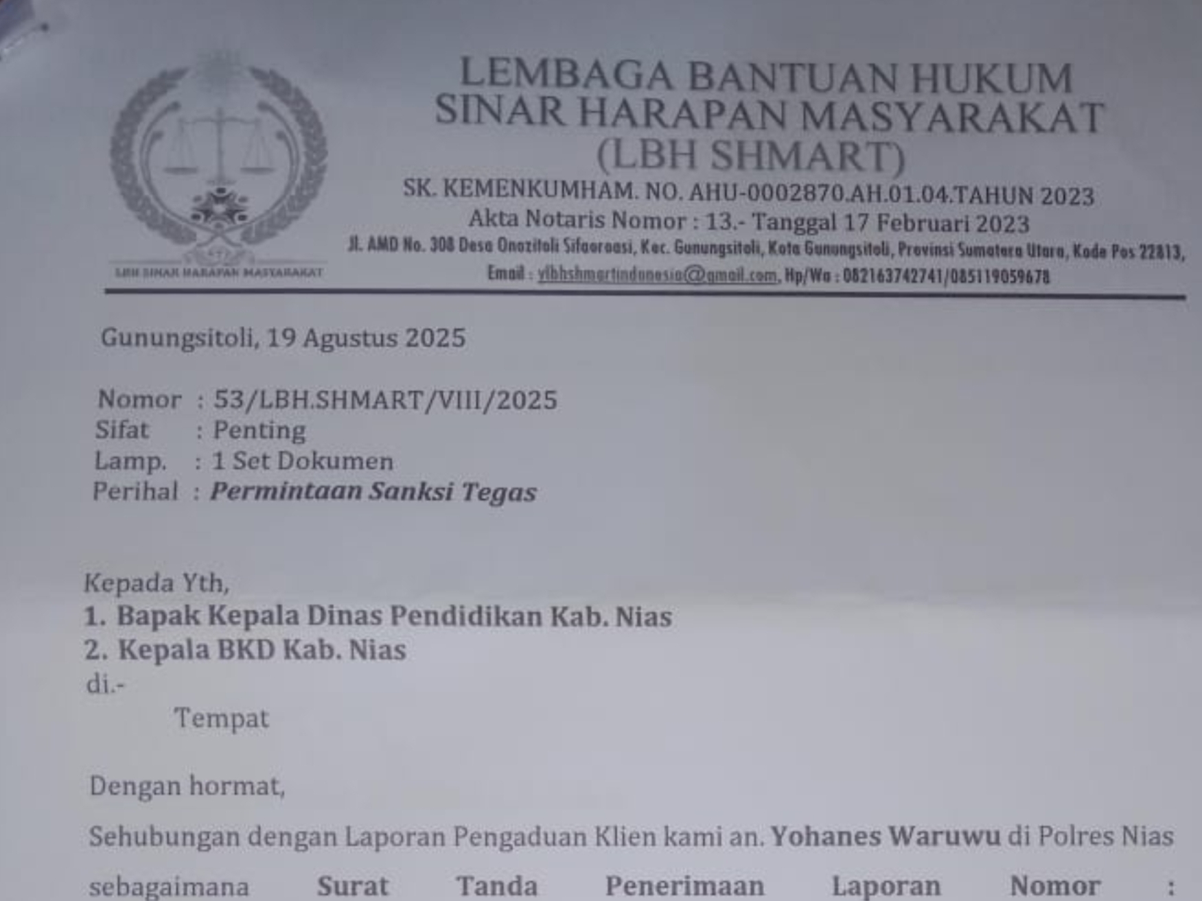 Disampaikan Yohanes, laporan saya di Polres Nias sudah mulai di proses dan telah di ambil keterangan saya. Namun kata Yohanes, kami juga telah menyurati Dinas Pendidikan Kabupaten Nias melalui Lembaga Bantuan Hukum Sinar Harapan Masyarakat (LBH SHMART) pada hari Rabu 20 Agustus 2025