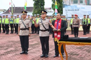 Kapolres Nias juga mengucapkan selamat kepada IPDA Ovaroni Zendrato, S.E. atas jabatan barunya sebagai Ps. Kasat Lantas Polres Nias, serta berpesan agar terus meningkatkan kinerja, berinovasi, dan memberikan pelayanan prima kepada masyarakat.